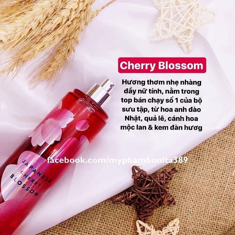 CHỐT MAU LẸ GIÁ IU THƯƠNG CHO BẠN NÀO NHANH TAY NÈ ‼️ 🌸 CHERRY BLOSSOM - ĐỆ NHẤT BÁN CHẠY DÒNG XỊT THƠM Xịt thơm toàn thân Bath & Body Works mùi Cherry Blossom✨ - Hương thơm được pha trộn từ hương quả lê, hoa anh đào Nhật Bản và gỗ đàn hương, mang lại nét quyết rũ, nữ tính cho người dùng. 🥰 😎Thành phần có chứa tinh chất lô hội Aloe Vera giúp dưỡng ẩm và dẫn chất hoa Cúc La Mã giúp làm dịu làn da. Mang lại cảm giác thư giãn cho bạn gái suốt cả ngày. 💦Xịt thơm toàn thân Bath & Body Works có thể giữ mùi được từ 6 - 8 giờ, để bạn tự tin khi giao tiếp. 🥀 Cherry Blossom đứng vị trí số 1 do tạp chí Fragrance của Mỹ bình chọn, là mùi hương gợi lên vẻ đẹp của khu vườn Nhật Bản ngát hương và sự duyên dáng tinh tế. 230kkkk