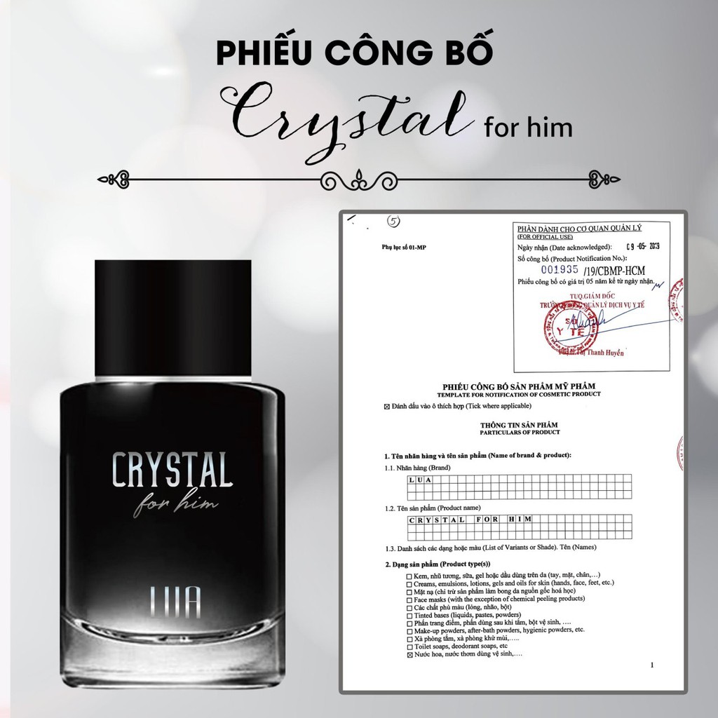 Nước Hoa Nam 𝐂𝐑𝐘𝐒𝐓𝐀𝐋 𝐅𝐎𝐑 𝐇𝐈𝐌 - LUA - Mang đặc trưng hương thơm nam tính, mãnh liệt. Mùi hương đậm, ấm rất lôi cuốn, nó còn là thứ “ma thuật” tạo nên bầu không khí lãng mạn. 𝐂𝐑𝐘𝐒𝐓𝐀𝐋 𝐅𝐎𝐑 𝐇𝐈𝐌 thích hợp cho những buổi tối hẹn hò, khi đi gặp khách hàng hay sử dụng đi làm hàng ngày. ➖ Phong cách: quyến rũ, thanh lịch, bí ẩn. ➖ Độ lưu hương: 12 giờ. ➖ Thời điểm khuyên dùng: ngày, đêm, Xuân, Thu, Đông. ------------- - Thành phần: Alcohol, Parfum, water, hydrogenated castor oil, xạ hương ... - Cách sử dụng: Giữ chai thẳng đứng, nhấn và xịt vào vùng tay và cổ. - Bảo quản: Để nơi khô ráo, thoáng mát. Tránh tiếp xúc trực tiếp với mắt và tránh xa tầm tay trẻ em. - Nguyên liệu nhập khẩu từ France, Sản Xuất và Đóng Gói bởi Thương Hiệu Lua Perfume tại Việt Nam. - Hạn sử dụng: 3 năm kể từ ngày sản xuất.