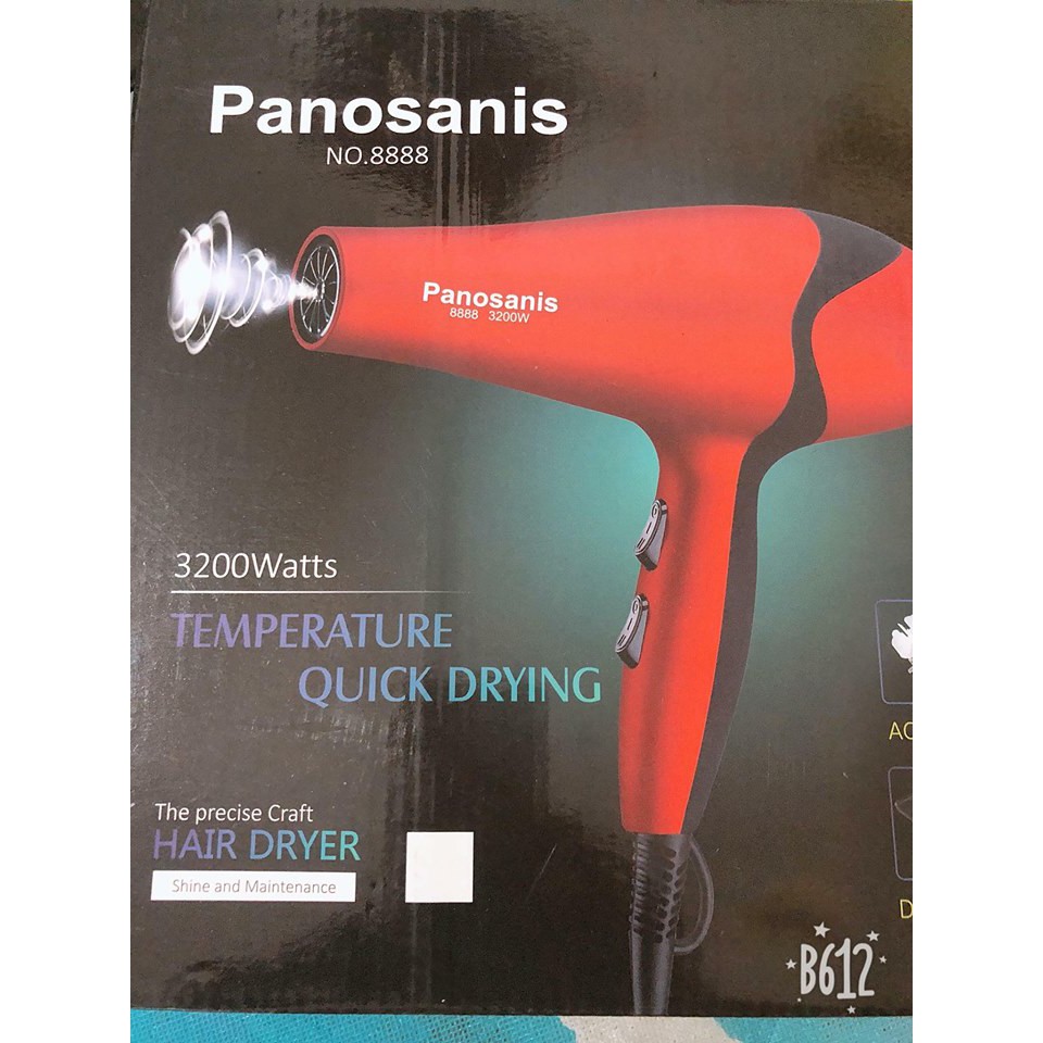 MÁY SẤY TÓC PANOSANIS 3200w 💞 Giá bán #150 🔐 CHỨC NĂNG CƠ BẢN CỦA SẢN PHẨM: ❶ Máy sấy tóc PANOSANIS 3200 có 2 tốc độ gió nóng và mát với kiểu dáng nhỏ gọn, màu sắc trang nhã, là một sản phẩm không thể thiếu trong bộ dụng cụ làm đẹp của các bạn gái. ❷ Máy có công suất lớn được thiết kế với 2 tốc độ sấy và chế độ sấy nhanh Turbo Dry giúp bạn tiết kiệm thời gian sấy khô tóc hàng ngày. ❸ Ngoài ra thì máy với 2 mức tốc độ và 2 mức nhiệt độ cho bạn có thể điều chỉnh luồng gió cho phù hợp với mái tóc của mình. ❹ Chế tạo bằng vật liệu kháng khuẩn. ❺ Ngoài ra bạn có thể thuận tiện mang theo khi đi du lịch. Móc treo ở đuôi máy giúp bạn treo máy lên tường sau khi sử dụng tránh hỏng máy. 🔐 THÔNG TIN SẢN PHẨM: 🔐 Máy sấy tóc PANOSANIS 3200W 🔐 Model: 3200 🔐 Máy sấy có 2 công tắc: 1 công tắc có chức năng bật/tắt 2 chiều nóng/lạnh, 1 công tắc điều chỉnh tốc độc sấy. 🔐 Dây điện dài 1.2m 🔐 Công suất 3200W 🔐 Nguồn điện 220V/50HZ