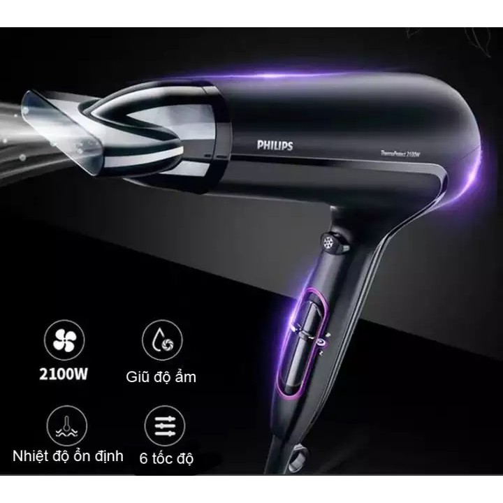 Máy sấy tóc Philips HP8230 2100W - Thông tin sản phẩm +Muốn có một mái tóc đẹp các bạn nữ thường bỏ nhiều thời gian đến các salon hay ra tiệm làm tóc để quan tâm và chăm chút, nhưng nay chỉ cần bạn sở hữu một chiếc máy sấy tóc tập hợp nhiều ưu điểm như chiếc máy sấy tóc Philips HP8230 thì bạn sẽ có một mái tóc bồng bềnh mà ai cũng phải trầm trồ khi ngắm nhìn. Được sản xuất theo công nghệ hiện đại, máy sấy tóc Philips HP8230 có kiểu dáng tinh xảo vừa vặn tay cầm giúp bạn dễ dàng tự mình thực hiện những thao tác trên tóc. +Ngoài ra, với thiết kế có đến 6 tốc độ, kết hợp với khe tạo kiểu sấy nhỏ, sẽ cho bạn những luồn khí chính xác trên những vùng tóc cần tạo kiểu, mái tóc bồng bềnh được định hình tuyệt đẹp mà không làm rối hay xù do khí quá lớn hoặc quá nóng. Đặc biệt, với những nút chỉnh được thiết kế mặt trong trên thân, để bạn dễ điều khiển tốc độ sấy, cùng với màu đen thời trang và kiểu dáng mềm mại, dây dài đến 1m8 sẽ tạo mọi sự tiện lợi thoải mái cho bạn, máy sấy tóc Philips HP8230 là một dụng cụ làm đẹp cho mái tóc mà bạn không thể thiếu. - Kiểu dáng sang trọng, dễ sử dụng +Máy sấy tóc Philips HP8230 với màu đen thời trang kết hợp với những đường gân mềm mại, tinh xảo chống trơn trượt, tạo nên một chiếc máy sấy tóc hợp thời trang và đẹp độc đáo. Máy sấy tóc Philips HP8230 có sáu mức độ gió dùng cùng với tính năng loại bỏ hiện tượng tĩnh điện, giúp cho bạn có một mái tóc đẹp bồng bềnh như ý. - Thiết kế an toàn +Máy sấy tóc Philips HP8230 được thiết kế lớp vỏ bọc bằng nhựa cao cấp, vừa có độ bền cao vừa tạo sự an toàn tuyệt đối cho người sử dụng. Ngoài ra, với khe gió hẹp tạo luồn khí chính xác lên từng vùng tóc, giúp bạn dễ dàng có những kiểu tóc đẹp theo ý muốn mà không làm sơ hay rối do khí quá mạnh, hoặc quá nóng. - Tiện dụng +Máy sấy tóc Philips HP8230 có thiết kế gọn nhẹ, bạn có thể sử dụng để làm đẹp ở bất kỳ nơi nào, đặc biệt với những tính năng chuyên dụng và tiện lợi như dây dài đến 1m8, đây có thể là một dụng cụ hỗ trợ làm đẹp cho các bạn tại nhà hoặc dùng làm đồ nghề trong các tiệm làm tóc chuyên nghiệp . Ngoài ra, bộ lọc khí có thể dễ dàng tháo rời, giúp bạn dễ dàng vệ sinh chiếc máy sấy tóc Philips HP8230 THÔNG SỐ KỸ THUẬT -Loại máy:Sấy tóc -Công suất: 2100 W -Điều chỉnh tốc độ: 6 mức -Tạo khí mát: Có -Chiều dài dây điện 1.8 m -Tần số: 50-60 Hz -Chất liệu vỏ:Nhựa ABS -Mô-tơ: Mô-tơ DC