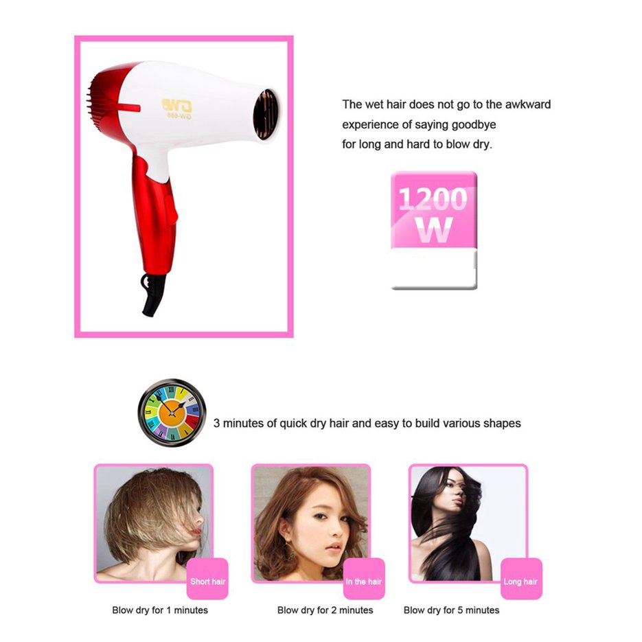 ✱BEST✱ GW-686 1Pc Mini Portable Hair Dryer Folding Foldable Compact Traveller Blower Features: Hot wind, low noise, long life. Fixed wire buckle folding handle and easy to carry and store. Suitable for school, travel, etc. 50℃ constant temperature, no harm to your hair. 3 gears adjustable, easy to operate. Descriptions: Model: GW-686 Power: 1200W Rated Voltage: 220V~50HZ Cable Length: 1.0M Gear: 3 Temp: 50℃ constant temperature Specifications: Material: plastic Color: red, blue Item Size: 220*165mm Plug Type: EU plug Package included: 1 x Hair Drier Notes: 1. Due to the difference between different monitors, the picture may not reflect the actual color of the item. We guarantee the style is the same as shown in the pictures. 2. Due to different personal measuring techniques, there might be 1-3cm error of the physical. Thank you!